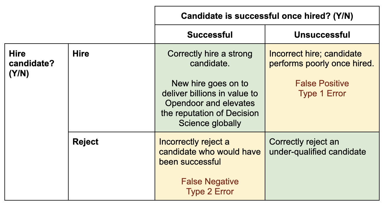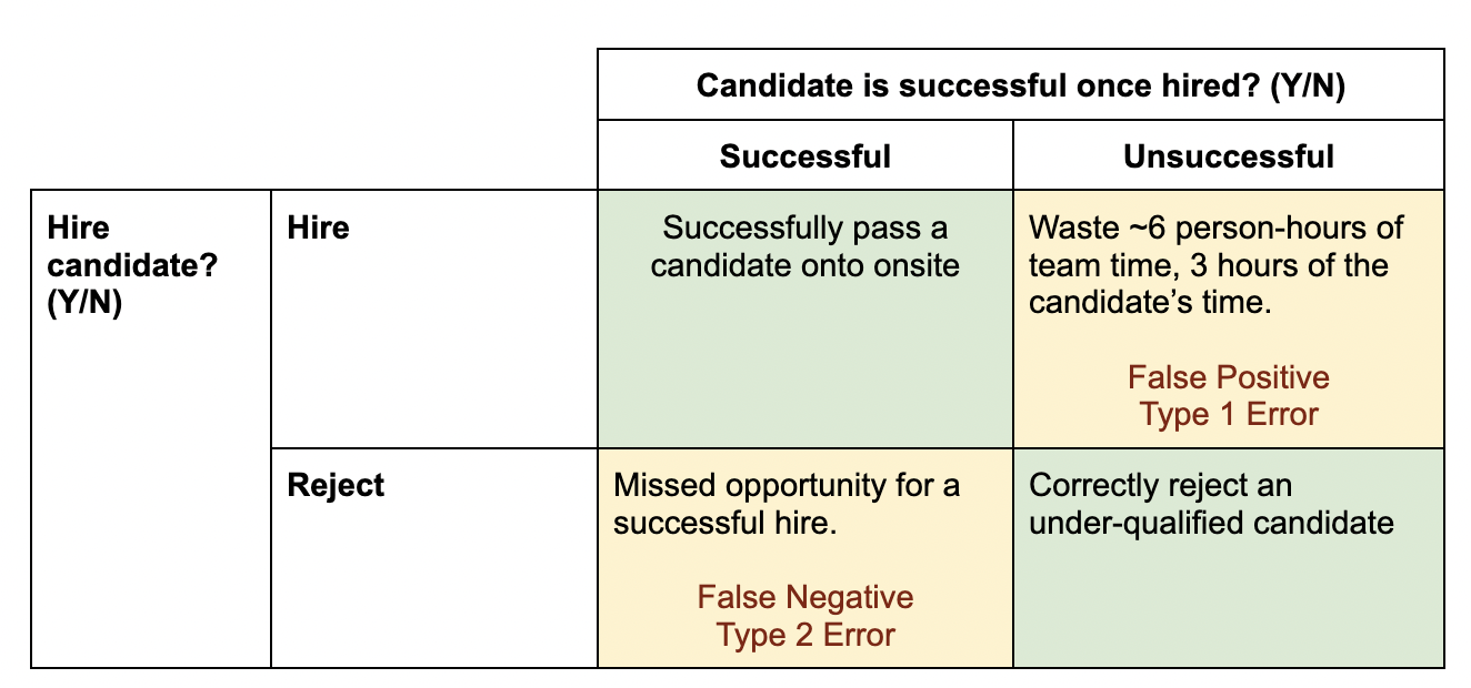 The end result is asymmetric risk between incorrectly hiring and incorrectly rejecting. Accidentally hiring a bad candidate will generally be far more painful than missing out on someone that could have been a fit.